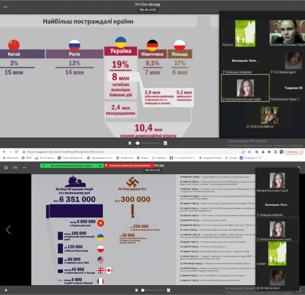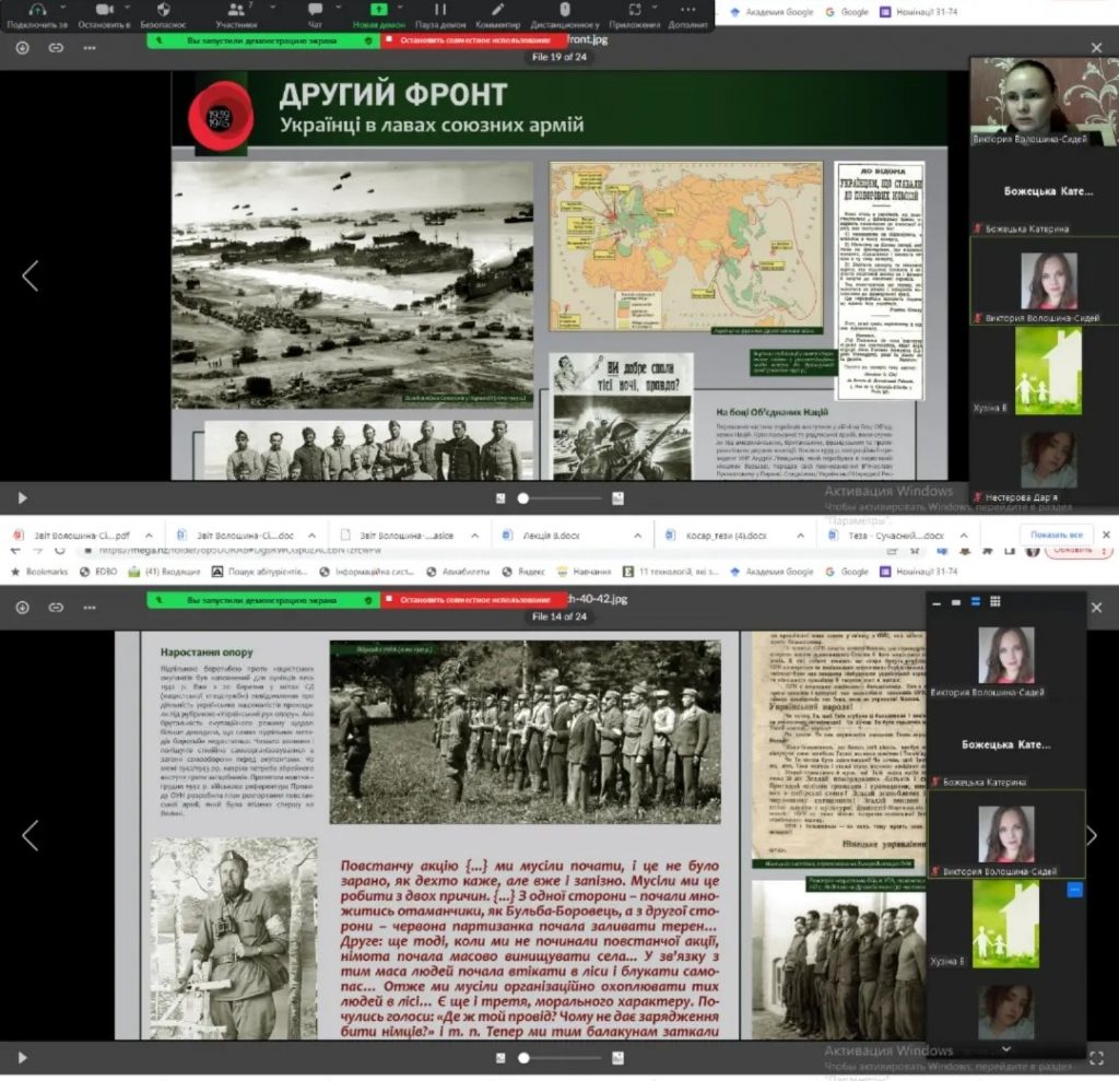 8 травня в Україні вшановують пам’ять жертв Другої світової війни та відзначають День пам’яті та примирення. З метою належного відзначення мужності та героїзму українського народу у боротьбі з нацизмом у Другій світовій війні, вшанування пам’яті жертв Другої світової війни, а також виховання у молоді почуття патріотизму, національної гідності, готовності до захисту своєї держави, викладачем кафедри економіки, менеджменту та фінансів було проведено тематичну онлайн зустріч-кінолекторій на тему: “Внесок українців у перемогу над нацизмом у Другій світовій війні”. Зі студентами 379 та 579 груп переглянули документальне відео про події ІІ Світової війни та виставку «Українська Друга світова», яка вперше представляє український вимір Другої світової війни. Від 1 вересня 1939 р., коли українці у складі Війська Польського стали до бою з гітлерівськими агресорами, до останніх пострілів на Далекому Сході – у війні з Японією. У центрі уваги експозиції – передусім Україна й роль українців у світовій війні. І найголовніше: внесок українського народу в перемогу над нацизмом. На всіх фронтах: від Атлантики до Тихого океану. Виставка «Українська Друга світова» створена спільними зусиллями Українського інституту національної пам’яті та Центру досліджень визвольного руху.