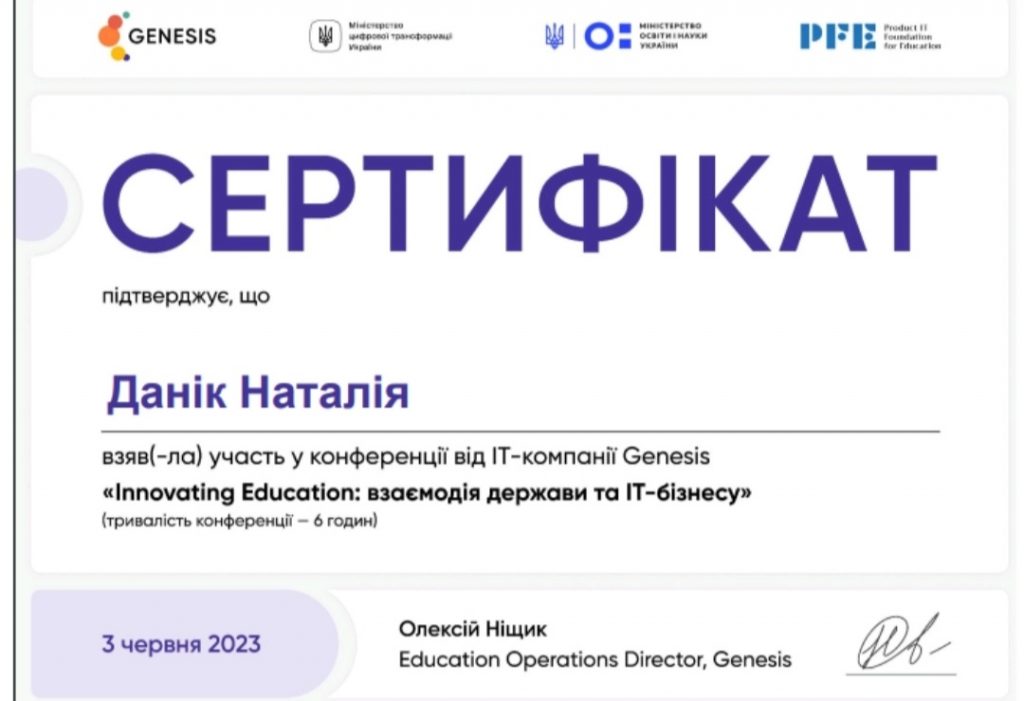 Завідувач кафедри економіки, менеджменту та фінансів Данік Наталія Вадимівна прийняла участь у конференції «Innovating Education: взаємодія держави та ІТ-бізнесу». Отримала дуже корисний досвід через панельні дискусії та воркшопи, що стануть у нагоді у наступній професійній діяльності. Отримала сертифікат від компанії Genesis. Дякуємо організаторам за крутий формат конференції!!!
