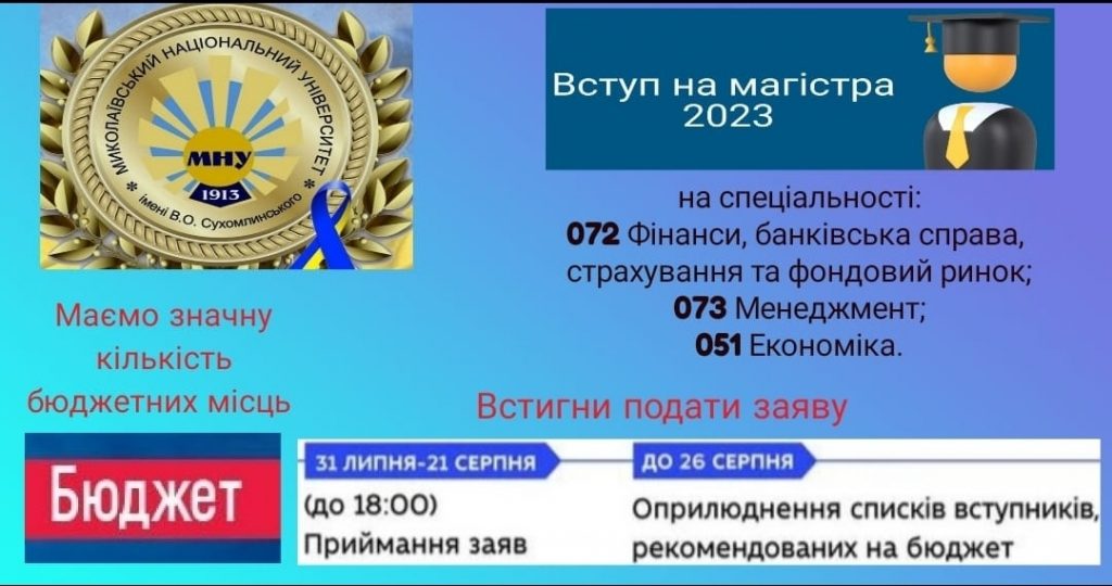 Миколаївський національний університет імені В. О. Сухомлинського продовжує прийом заяв на здобуття ступеня магістра зі спеціальностей: