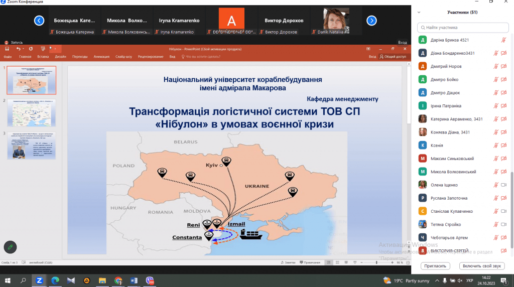 24 жовтня 2023 кафедрою економіки, менеджменту та фінансів Миколаївського національного університету імені В.О. Сухомлинського та кафедрою менеджменту Національного університету кораблебудування імені адмірала Макарова було проведено панельну дискусію “Транспортна інфраструктура Південного регіону України – практичний досвід подолання військових викликів та загроз”. На цей захід було запрошено провідних роботодавців-стейкхолдерів нашого регіону в транспортному секторі. Модераторами заходу виступили – Стройко Тетяна Володимирівна професор кафедри економіки, менеджменту, та фінансів Миколаївського національного університету імені В.О. Сухомлинського та Іщенко Олена Анатоліївна доцент кафедри менеджменту Національного університету кораблебудування імені адмірала Макарова. Спікерами заходу стали представники провідних транспортно-логістичних компаній регіону: