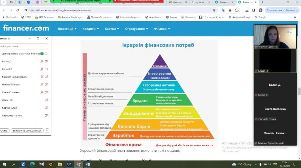 Метою заняття було ознайомлення здобувачів освіти із сутністю поняття”фінансове планування”, видами фінансових планів та порядком їх розробки. Мета заняття була реалізована у повному обсязі. Заняття супроводжувалося прикладами конкретних практичних ситуацій, які дали змогу здобувачам на реальних прикладах фінансових планів підприємств детальніше вивчити проблемні питання теми. Під час заняття здобувачі ознайомилися із видами фінансових планів, дослідили алгоритм їх розробки та затвердження на підприємстві. Наприкінці заняття було проведено експрес- тестування за допомогою інтерактивної платформи Kahoot, що дозволило закріпити опрацьований матеріал. Заняття було організовано на належному організаційному та методичному рівні із застосуванням сучасних засобів дистанційного навчання.
