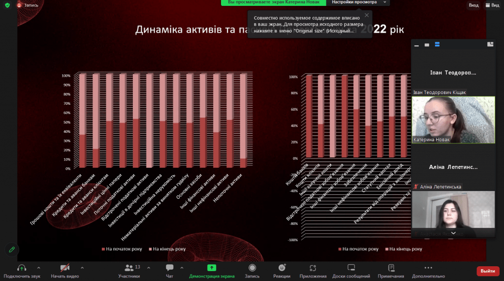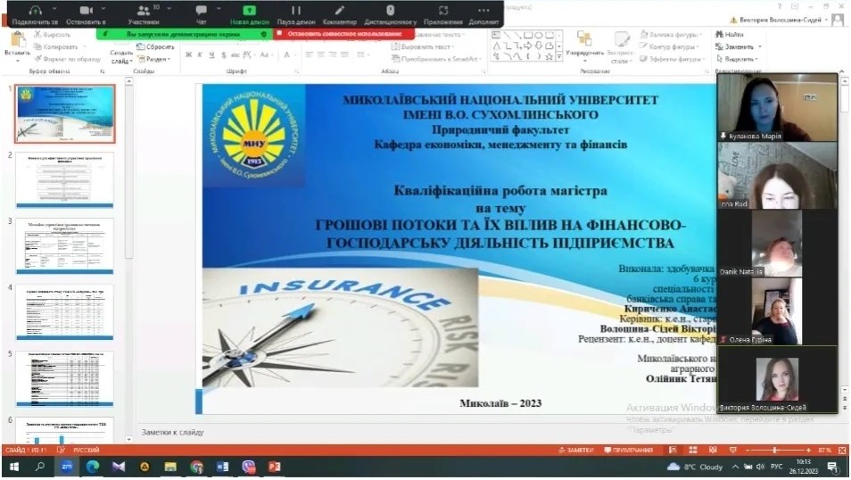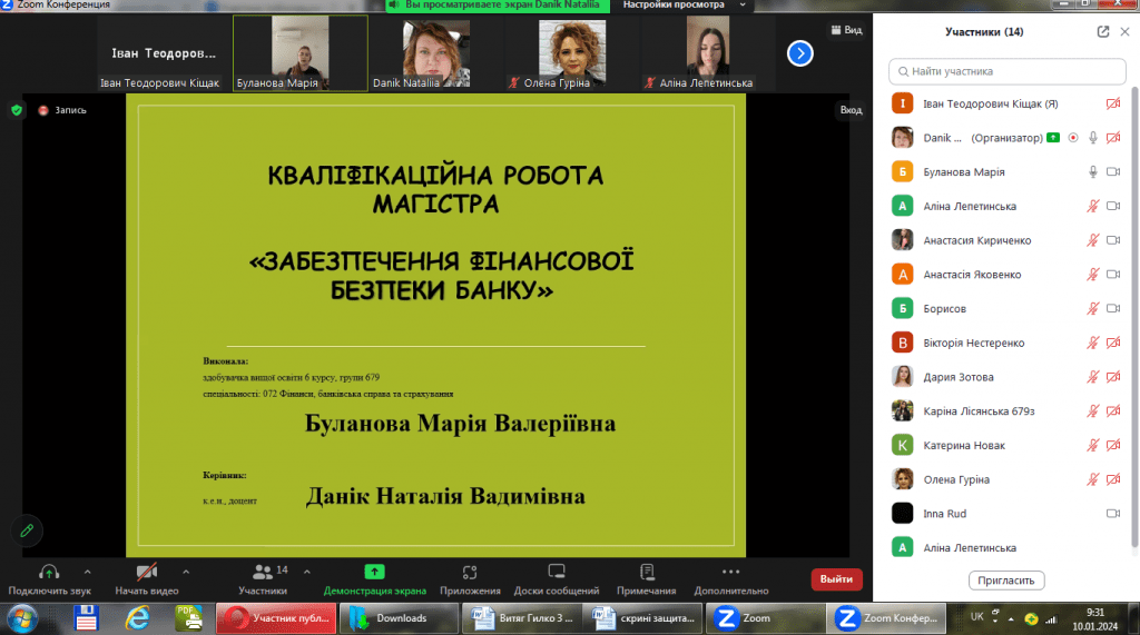 10 січня відбулися захисти кваліфікаційних робіт магістрантів денної та заочної форми навчання спеціальності 072Фінанси, банківська справа та страхування. Здобувачі освіти продемонстрували результати своїх наукових досліджень на високому рівні, відповідали на питання членів комісії та зауваження рецензентів. Загалом, магістранти показали грунтовні знання, результати досліджень можуть бути використані у практичній діяльності суб’єктів господарювання, які виступали об’єктами дослідження. Дякуємо рецензентам та голові екзаменаційною комісії, представнику роботодавців, керівнику ТОВ ” АКТАН” Борисову Володимиру за головування та активну участь у захисті. Здобувачів вітаємо з успішним захистом та присвоєнням кваліфікаційного рівня магістра з фінансів, банківської справи та страхування.