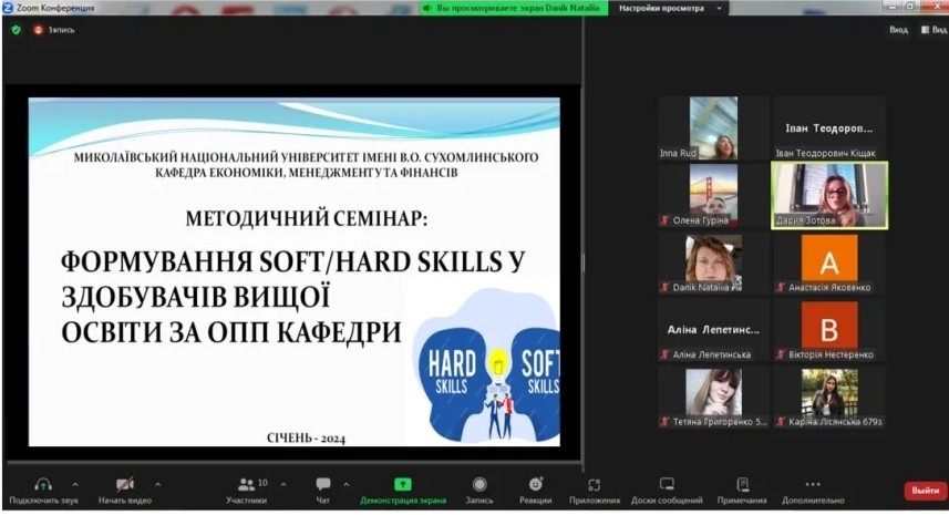 25 січня 2024 р. відбувся методичний семінар кафедри економіки, менеджменту та фінансів на тему: «Формування soft/hard skills у здобувачів вищої освіти за ОПП кафедри». З доповіддю «Формування навичок soft/hard та принципів академічної доброчесності у здобувачів вищої освіти при викладанні дисциплін за спеціальностями кафедри» виступила керівник семінару, професорка кафедри, д.е.н. ОЛЕНА Гуріна. Семінар був присвячений розробці методів поєднання у навчальному процесі елементів навчання, які дозволяють сформувати навички soft/hard та принципи академічної доброчесності у здобувачів вищої освіти за спеціальностями кафедри 072 «Фінанси, банківська справа та страхування», 073 «Менеджмент» та 051 «Економіка».