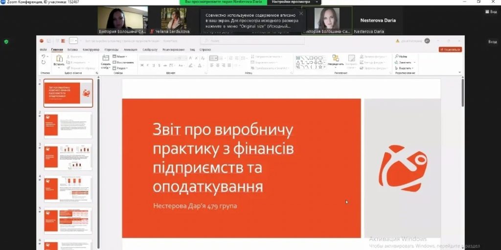На кафедрі економіки, менеджменту та фінансів відбувся он-лайн захист Звітів з виробничої практики з фінансів підприємства та оподаткування студентами четвертого курсу спеціальності 072 Фінанси, банківська справа та страхування за участю керівника від університету – к.е.н. Волошиної -Сідей В.В., завідувачки кафедрою, к.е.н. доцента Данік Наталії Вадимівни та к.е.н., доцента Рудь Інни Юріївни.