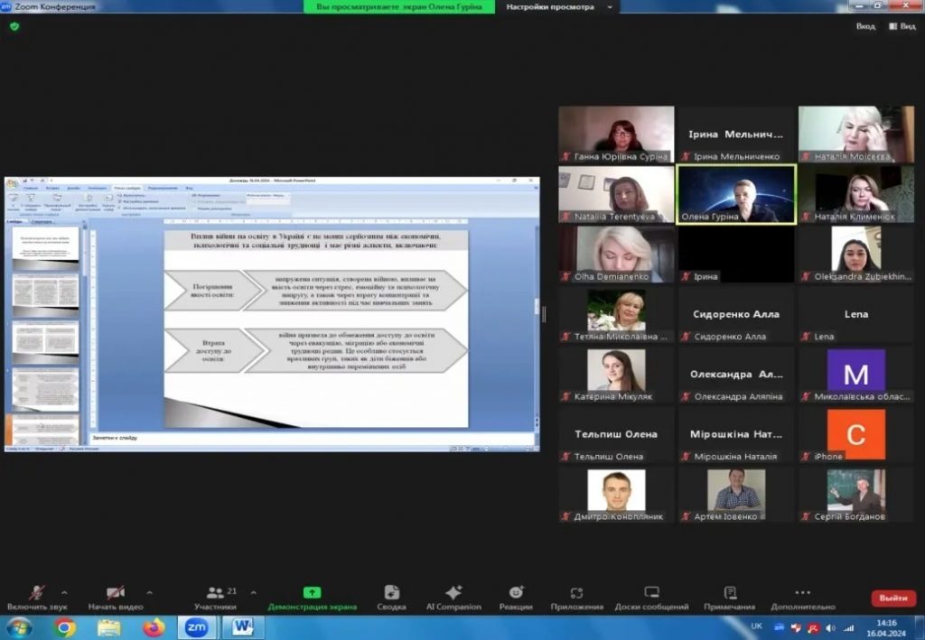 16 квітня 2024 року на базі Миколаївської обласної універсальної наукової бібліотеки відбулося чергове засідання наукової студії «Освіта Миколаївщини: нові наукові орієнтири» за темою «Наукові дослідження та освітні інновації в період воєнного стану». Професорка кафедри економіки, менеджменту та фінансів Олена Гуріна взяла активну участь в обговоренні теми із доповіддю «Освітні втрати під час війни: компенсація та діагностика».