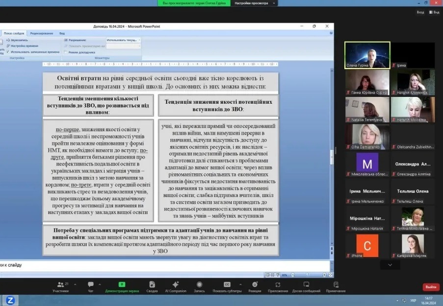 Під час виступу доповідачка закцентувала увагу присутніх на ключових факторах, які призводять до освітніх втрат. Також було зазначено, що освітні втрати на рівні середньої освіти сьогодні вже тісно корелюють із потенційними втратами у вищій школі. До основних із них доповідачка віднесла: тенденцію зменшення кількості вступників до ЗВО, тенденцію зниження якості потенційних вступників до ЗВО та потреба у спеціальних програмах підтримки та адаптації учнів до навчання на рівні вищої освіти. Не залишилася поза увагою характеристика викликів, з якими вже сьогодні стикаються викладачі, зокрема, під час формування «жорстких» та «м’яких» навичок у майбутніх фахівців.