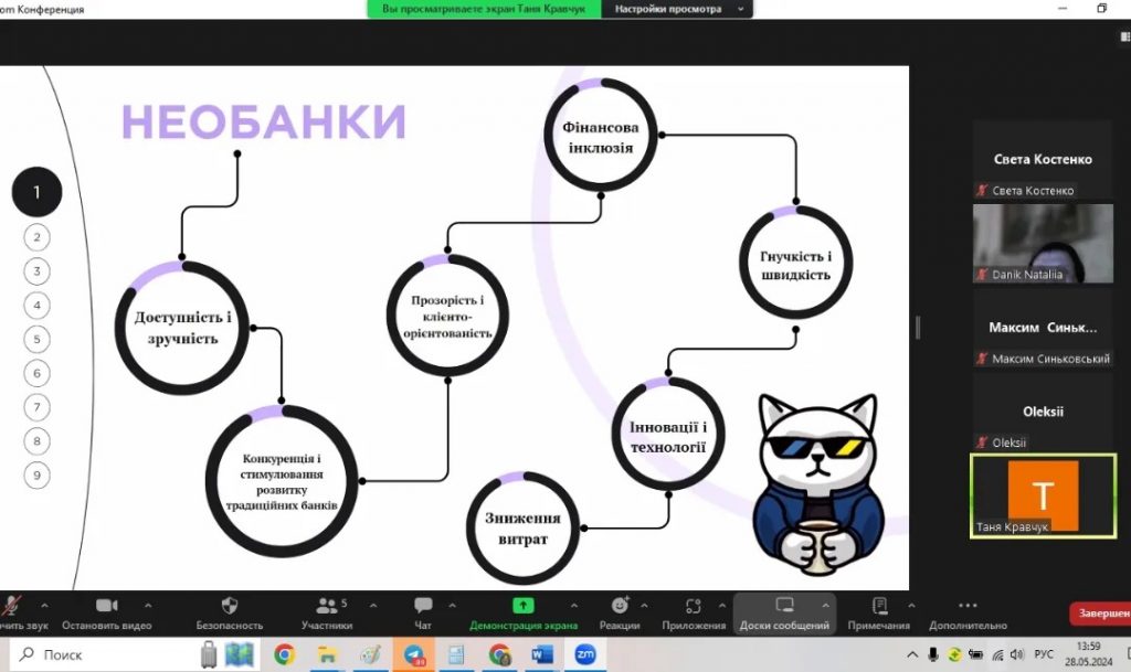 Захід проходив у форматі відеоконференції, що дало можливість залучити до обговорення не лише студентів та викладачів кафедри, але й експертів із банківського сектору та інших академічних установ. Цей інтерактивний підхід забезпечив глибокий аналіз та обговорення робіт, що сприяло розвитку критичного мислення та професійних навичок у студентів.