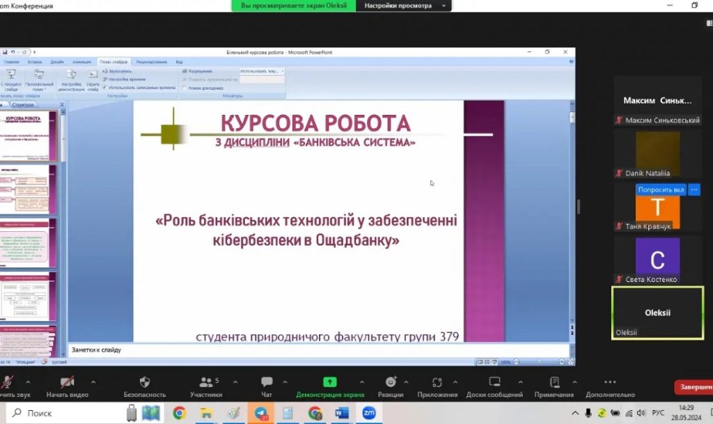 28 травня 2024 року на базі кафедри економіки, менеджменту та фінансів Миколаївського національного університету імені В.О. Сухомлинського відбувся онлайн захист курсових робіт з дисципліни “Банківська система”. Студенти 3 курсу представили свої дослідження, виконані під керівництвом доцента Данік Наталії Вадимівни.