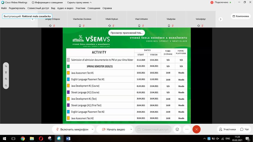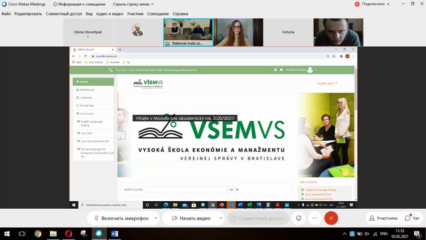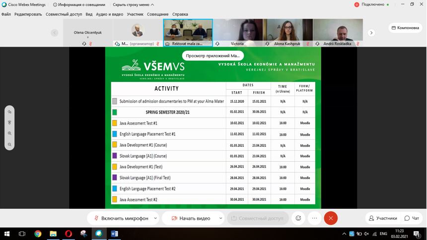 В середу 03.02.2021 пройшла онлайн-зустріч з проректором Вищої школи менеджменту та публічного адміністрування в Братиславі (School of Economics and Management in Public Administration in Bratislava) та студентами українських закладів вищої освіти спеціальності 122 «Комп’ютерні науки». На зустрічі також були присутні наші студенти-магістранти Оксентюк Олена та Кунічик Ігор та завідувач кафедри інформаційних технологій Зосімов В.В.