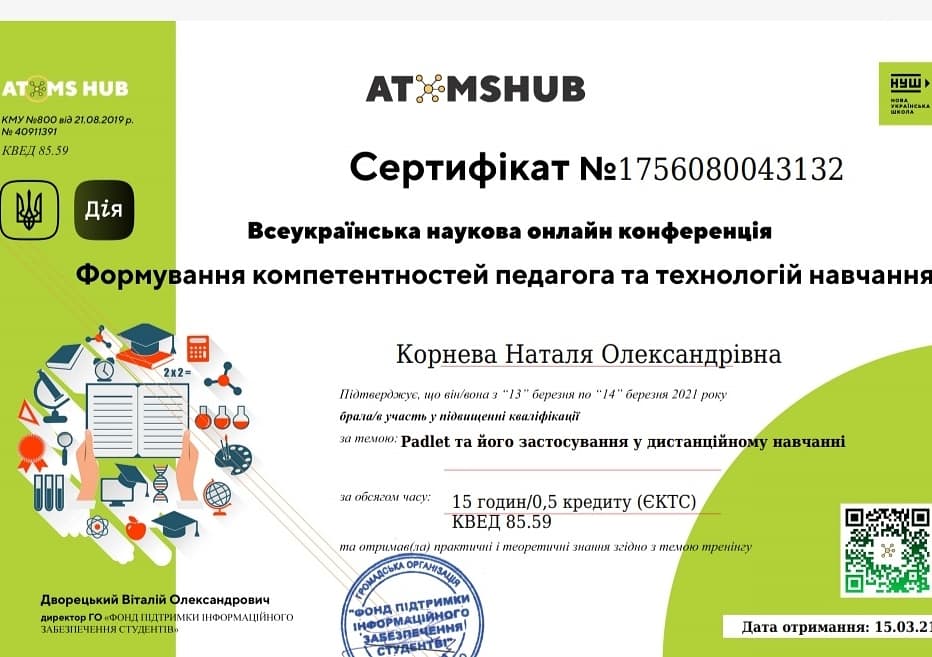 Доцент кафедри фінансів та обліку Корнєва Н.О. прийняла участь у Всеукраїнській науковій онлайн конференції “Формування компетентностей педагога та технологій навчання”, за результатами якої отримала сертифікати підвищення кваліфікації за тематикою “Padlet та його використання у дистанційному навчанні” , а також ” Онлайн інструменти Canva, Prezi, LearningApps, Kahoot, Quizizz, Gamilab для організації дистанційного навчання”.