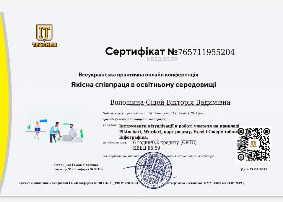 В умовах сьогодення виникає необхідність у постійному навчанні та вдосконаленні компетенцій, викладачі кафедри фінансів та обліку постійно підвищують свої професійні навички. Так, к.е.н. старший викладач кафедри фінансів та обліку Волошина-Сідей В.В. прийняла участь у тренінгах конференції “Якісна співпраця в освітньому середовищі” та вдосконалила свої навички із застосування інформаційних систем у навчанні. Успішно пройшла тренінги “Інструменти візуалізації в роботі викладача на прикладі Piktochat, Wordart, карт розуму, Excel і Google таблиць” та “Microsoft Office для організації дистанційного навчання”