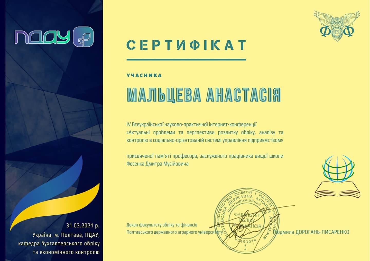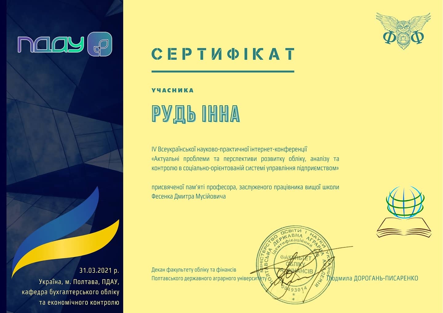 Доцент кафедри фінансів та обліку Рудь І.Ю. разом з магістранткою спеціальності 072 фінанси, банківська справа та страхування Мальцевою Анастасією прийняли участь у IV Всеукраїнській науково-практичній інтернет- конференції “Актуальні проблеми та перспективи розвитку обліку, аналізу та контролю в соціально- орієнтованій системі управління підприємством”, яка була присвячена пам’яті професора, заслуженого працівника вищої школи Фесенка Дмитра Мусійовича