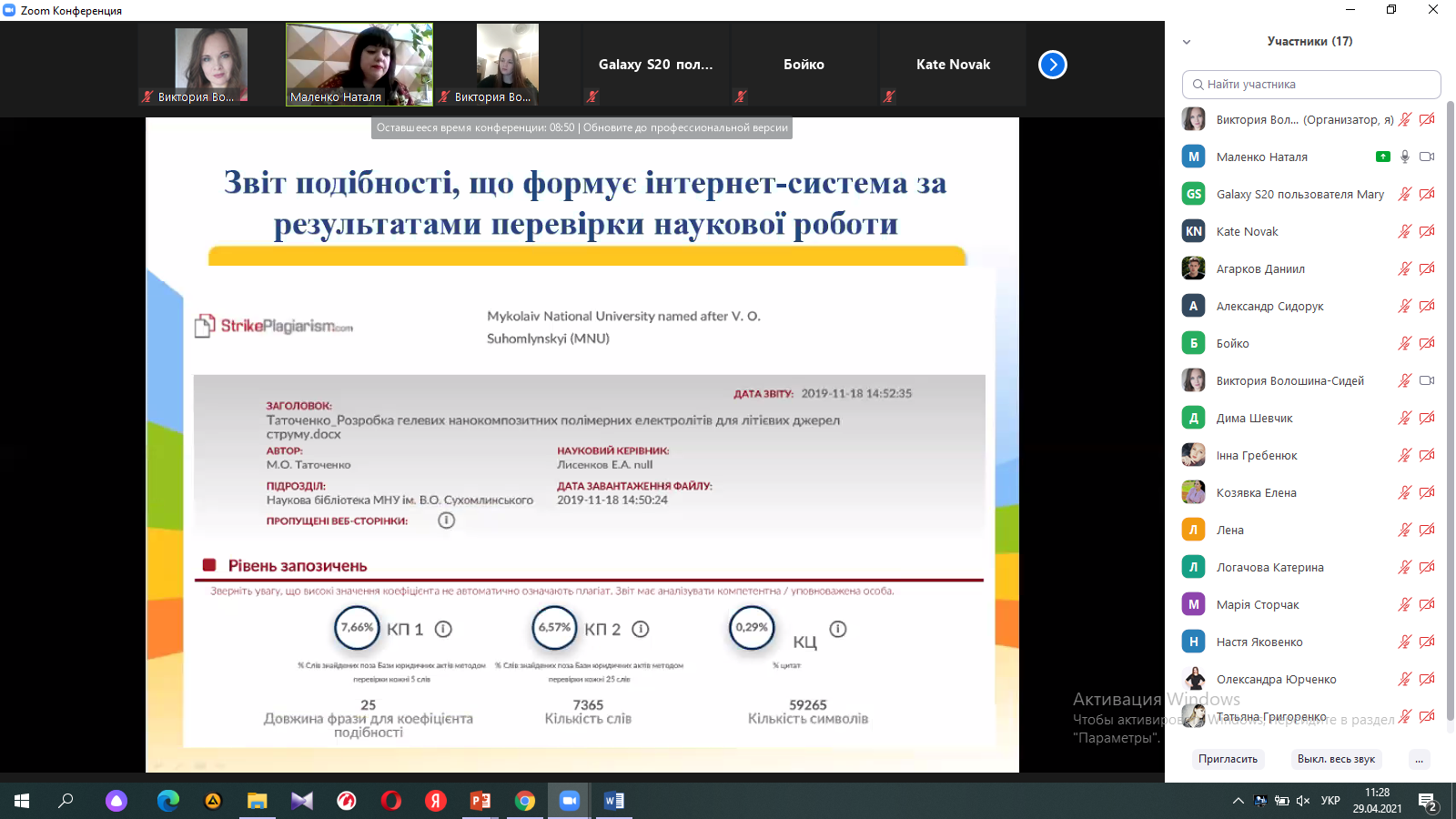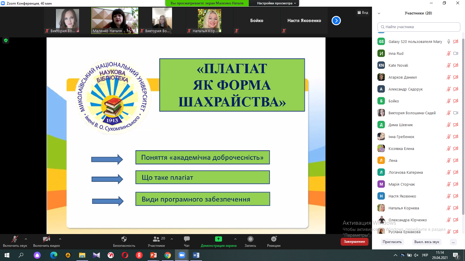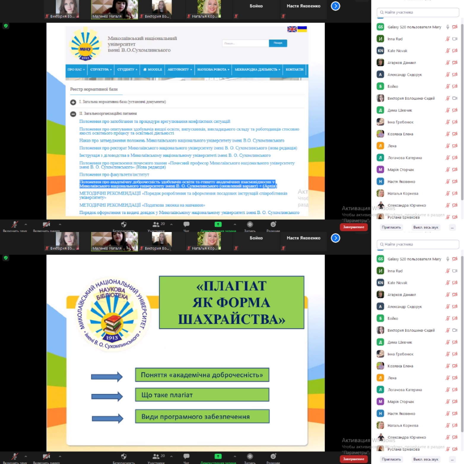 Завідувач сектора комп’ютерного забезпечення бібліотеки МНУ імені В.О.Сухомлинського Маленко Наталя Василівна розповіла про види академічного плагіату, програмне забезпечення, за допомогою якого здійснюється перевірка робіт на плагіат та донесла до відома студентів необхідність виконання робіт з дотриманням правил академічної доброчесності. Особлива увага була приділена правила оформлення посилань на літературні джерела при виконанні робіт. Інформація була дійсно корисною.