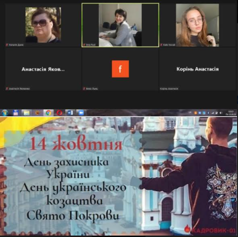 Викладачами кафедри Рудь І. Ю. та Данік Н.В. була проведена виховна година з групами 479, 279 СК та 379 з дня нагоди святкування в Україні Дня захи́сникі́в і захи́сни́ць Украї́ни, святами Покрови Пресвятої Богородиці та Днем Українського козацтва