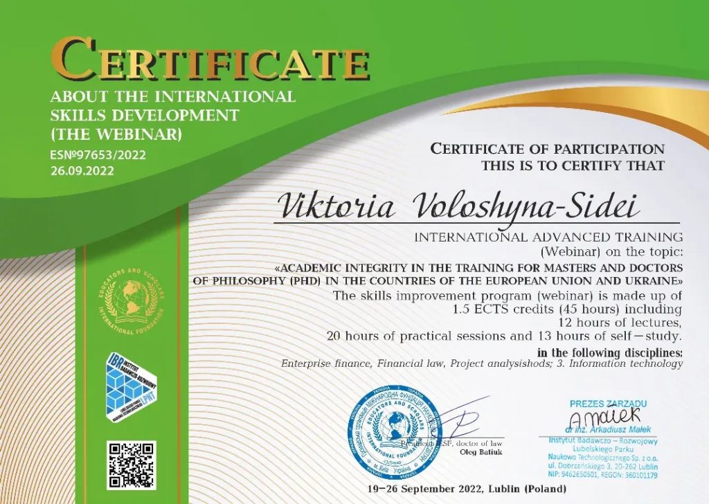 З 19 по 26 вересня 2022 року доцент кафедри економіки, менеджменту та фінансів МНУ ім. В.О. Сухомлинського Данік Наталія Вадимівна та Волошина-Сідей Вікторія Вадимівна приймали участь у Міжнародному підвищенні кваліфікації (Вебінарі) для освітян на тему: ««Академічна доброчесність при підготовці магістрів та здобувачів доктора філософії (PhD) в країнах Європейського союзу та Україні» у м. Люблін (Республіка Польща).