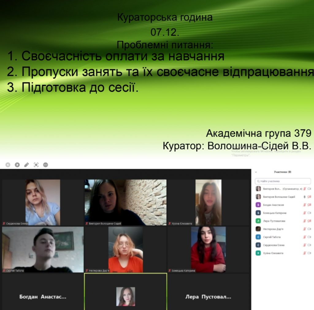 Напередодні заліково-екзаменаційної сесії викладачем кафедри економіки, менеджменту та фінансів Волошиною-Сідей В.В. проведено кураторську годину зі студентами 379 групи спеціальності 072 Фінанси, банківська справа та страхування. Предметом обговорення стали питання пов’язані з підготовкою до сесії, своєчасністю закриття кредитів та необхідністю погашення боргів з оплати за навчання. Староста групи Сердюкова Олена доповіла про поточну ситуацію з відвідуванням занять онлайн та своєчасністю здачі робіт студентами групи. Вирішено посилити контроль за навчанням студентів, за якими рахуються “борги”. Після проведення кураторської години викладачем відпрацьовано проблемні моменти зі студентами, які не з’явилися, в форматі телефонних розмов.