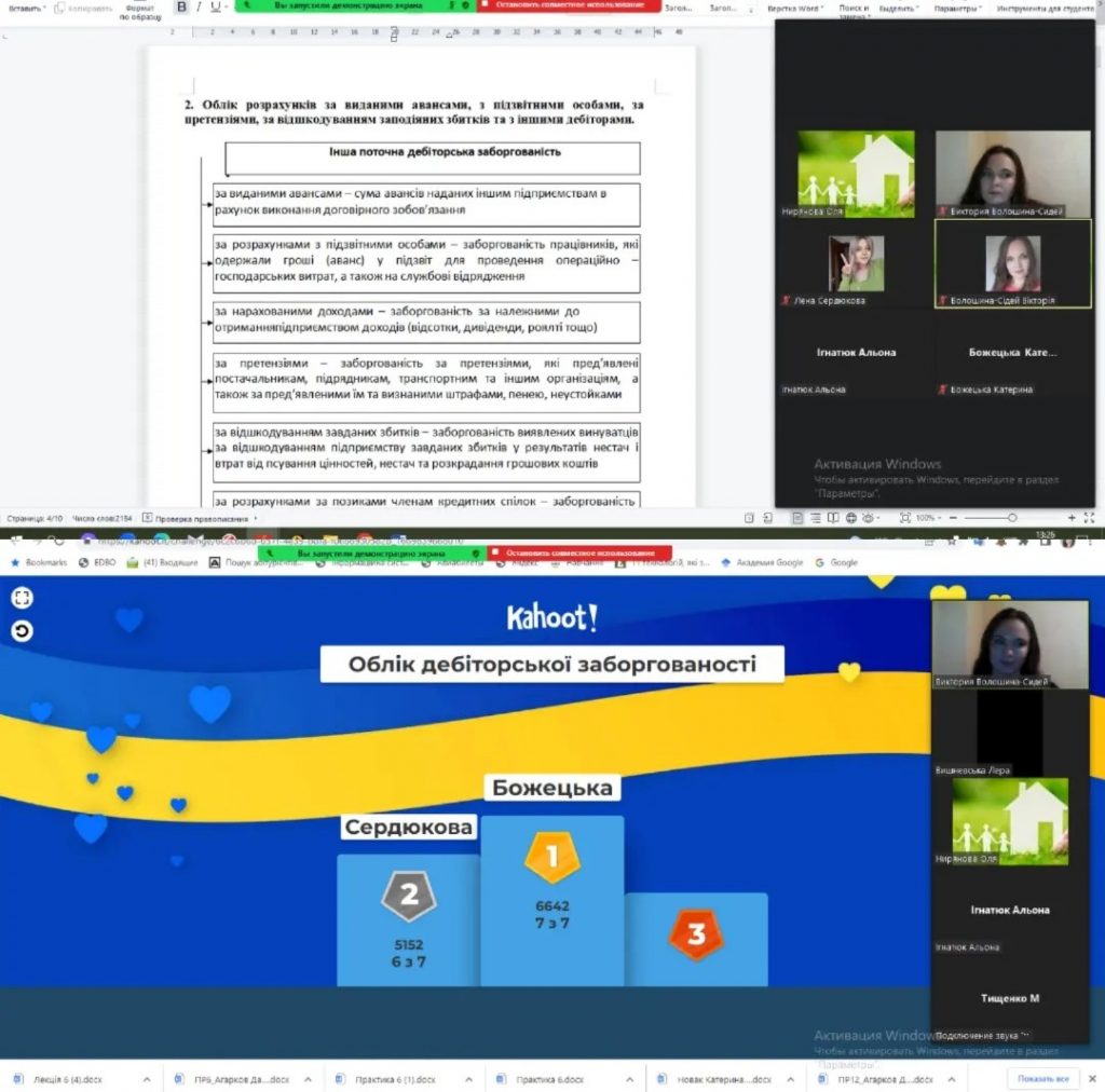 Метою заняття було ознайомлення здобувачів освіти із сутністю поняття”дебіторська заборгованість”, методикою визнання та оцінки дебіторської заборгованості та порядком синтетичного та аналітичного обліку виникнення та погашення заборгованостей контрагентів, підзвітних осіб та розрахунків за претензіями. Мета заняття була реалізована у повному обсязі. Заняття супроводжувалося прикладами конкретних практичних ситуацій, які дали змогу здобувачам на реальних прикладах детальніше вивчити проблемні питання обліку та оцінки дебіторської заборгованості. Під час заняття здобувачі ознайомилися з первинними та зведеними документами, навчилися розраховувати резерв сумнівних боргів, детально опрацювали нормативно-законодавчу базу з обліку дебіторської заборгованості. Наприкінці заняття було проведено експрес- тестування за допомогою інтерактивних занять Kahoot, що дозволило закріпити опрацьований матеріал. Заняття було організовано на належному організаційному та методичному рівні із застосуванням сучасних засобів дистанційного навчання.
