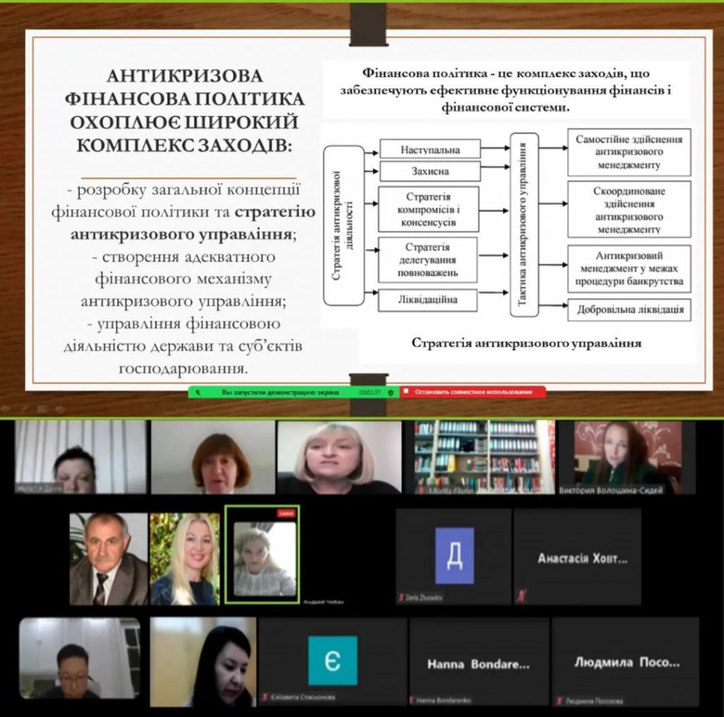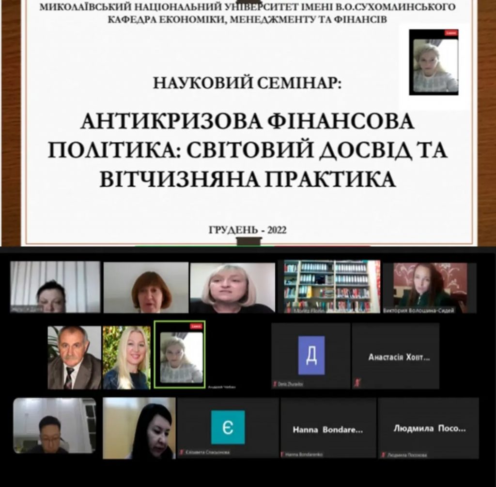 24 грудня 2022 р. відбувся науковий семінар кафедри економіки, менеджменту та фінансів на тему: «Антикризова фінансова політика: світовий досвід та вітчизняна практика». З доповіддю «Anti-crisis financial management tools» виступила керівник семінару, професорка кафедри, д.е.н. ОЛЕНА Гуріна. Семінар був присвячений обговоренню актуальних проблем формування та реалізації антикризової фінансової політики в контексті вивчення досвіду іноземних країн і практики реалізації в Україні. У семінарі взяли участь викладачі кафедри, науковці з різних університетів: Миколаївського національного аграрного університету, Уманського національного університету садівництва, ВСП ЗВО «Відкритий міжнародний університет розвитку людини «Україна» Миколаївського інституту розвитку людини, та стейкхолдери. ОЛЕНА Гуріна презентувала колегам ключові інструменти антикризової фінансової політики в контексті світового досвіду та визначила можливості їх імплементації у вітчизняну практику фінансового управління. Коментатором виступила завідувач кафедри економіки, менеджменту та фінансів, доцент кафедри, к.е.н. НАТАЛІЯ Данік. До обговорення долучилися заступниця начальника Головного управління ДПС у Миколаївській області, к.е.н. ОЛЬГА Купчишина та заступниця начальника управління податкового адміністрування ВІКТОРІЯ Трофименко.