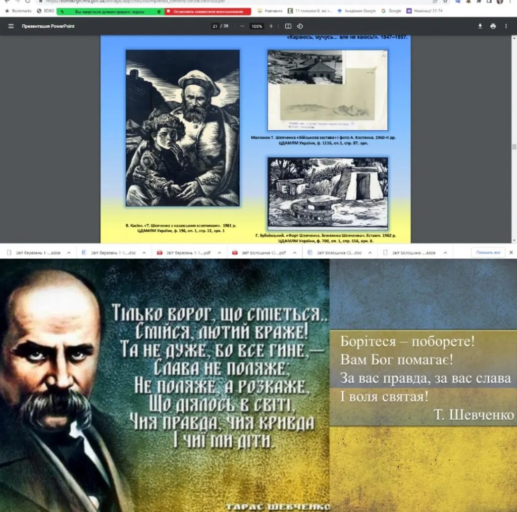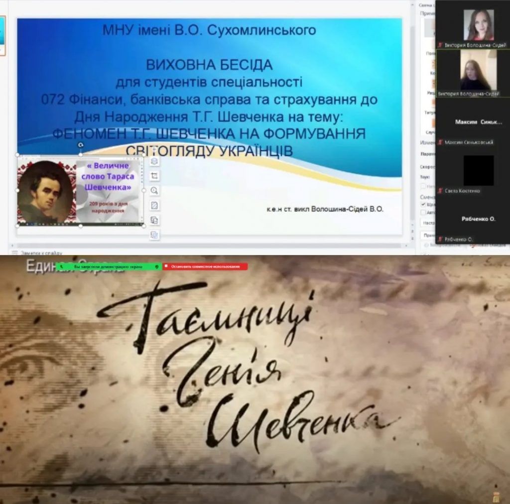 З метою формування у молоді національної свідомості, патріотизму та любові до української мови, поезії, літератури на кафедрі економіки, менеджменту та фінансів к.е.н Волошина-Сідей В.В. та к.е.н. доцент Рудь І.Ю провели виховні заходи, присвячені Дню Народження Т.Г. Шевченка у групах 279, 379 та 579. Під час заходів переглянули фільм – біографію митця “Таємниці генія Шевченка”, обговорили зі студентами значущість митця у формуванні свідомості українців, згадали про актуальність його творів і нині. Здобувачі освіти поділилися своїми роздумами та улюбленими творами Кобзаря.