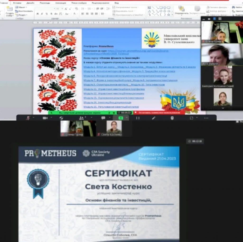 Цього року під час навчальної практики здобувачі опановували практичний курс «Основи фінансів та інвестицій» через платформу масових відкритих он-лайн курсів Prometheus. В результаті успішного проходження курсу всі здобувачі отримали відповідні сертифікати. 5 травня відбувся захист звітів із навчальної практики під час якого здобувачі поділилися своїми враженнями про курс, відповіли на всі питання комісії. Здобувачі зазначили, що така форма навчання є зручною та ефективною, оскільки передбачає самостійне планування своєї роботи над курсом, враховуючи індивідуальні особливості щодо сприймання та засвоєння матеріалу.